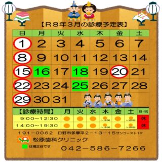 2026 3/02 【お知らせ】3月の診療日 2026.03.02 お知らせ, 今月の診療日, 歯科矯正 お知らせ・ 休診日・ 矯正 今月の休診日は 3/20金・春分の日 と日曜日です 矯正相談日は 3/16月 3/18水 3/25水となりますので、ご希望の方はご連絡ください